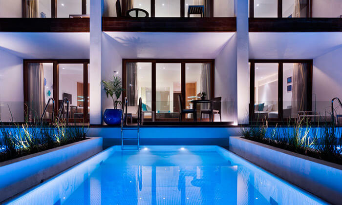 הבריכה הינה בריכת אינסוף, אשר תוכננה כך שכשהאורחים משכשכים במים, קו האפס משיק קו דמיוני לשפת הים ונראה כאילו הבריכה מתמזגת לכחול אחד גדול (סוויטה עם בריכה הינה מותאמת לזוגות בלבד ללא ילדים ותינוקות).